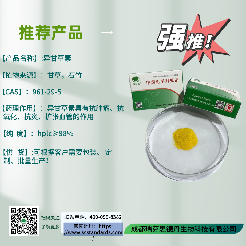 【藥理作用】:異甘草素具有抗腫瘤、抗氧化、抗炎、擴張血管的作用