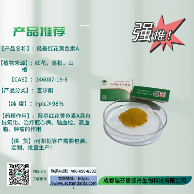 【儲存方式】:避光、密閉;2-8℃【羥基紅花黃色素A具有熱不穩定性的特征,光照和溫度對該產品的穩定性影響比較大。當溫度高于60℃,加熱一定時間后,羥基紅花黃色素A就會發生水解;在避光條件下,羥基紅花黃色素A具有較好的穩定性。】